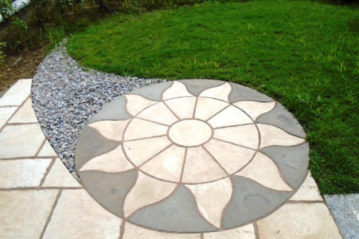 Kit Piazzole Decorative: Chalice Paving color miele include kit completo da 5,76 mq con Piazzola Chalice Circle coordinata. Sun Circle Kit e Piazzola Circolare diametro 2,56 mq creano punti focali circolari per zone relax o decorative.